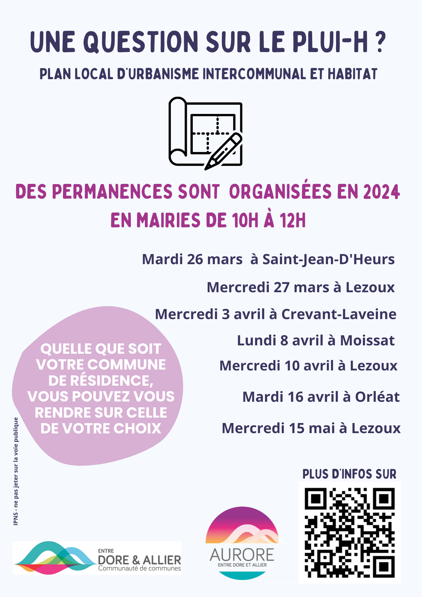 D'autre part, pour rappel, toutes les infos sur le PLUIH sont disponibles sur le site Internet de la communauté de communes Entre Dore et Allier http://www.ccdoreallier.fr/urbanisme-eau-environnement/le-projet-aurore/